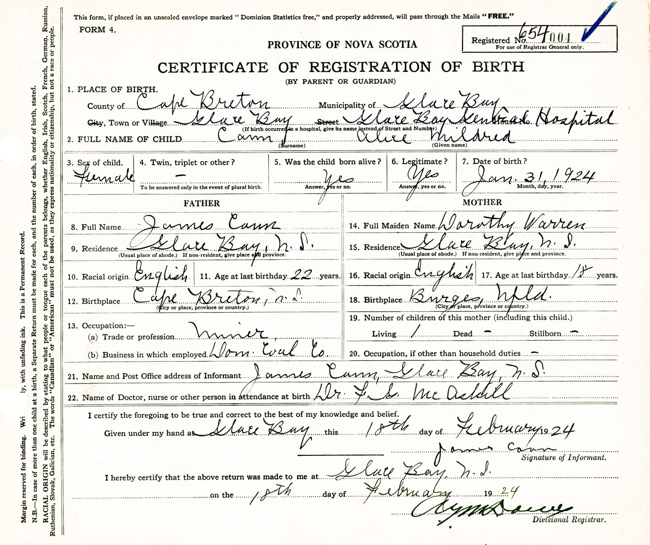 Female Birth Registration: Year: 1924 number: 65400004