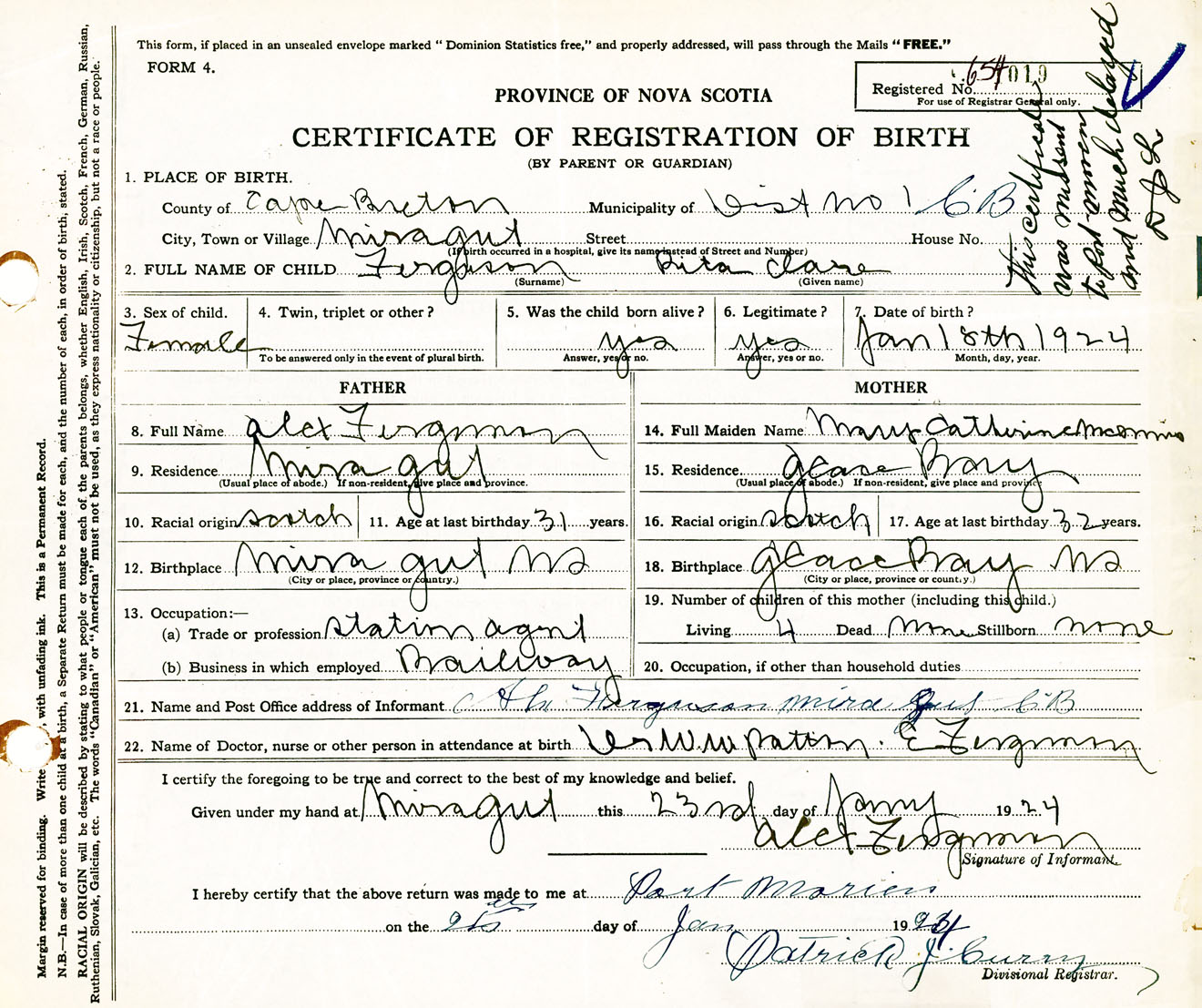 Female Birth Registration: Year: 1924 number: 65400019