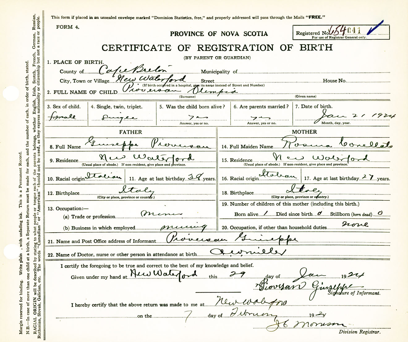 Female Birth Registration: Year: 1924 number: 65400041