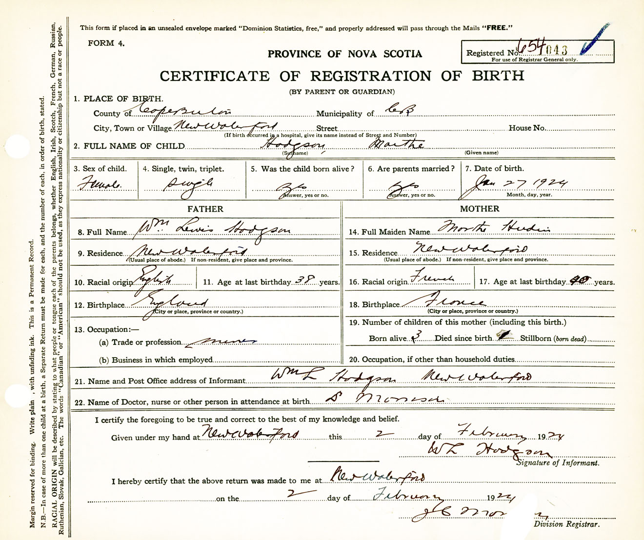 Female Birth Registration: Year: 1924 number: 65400043