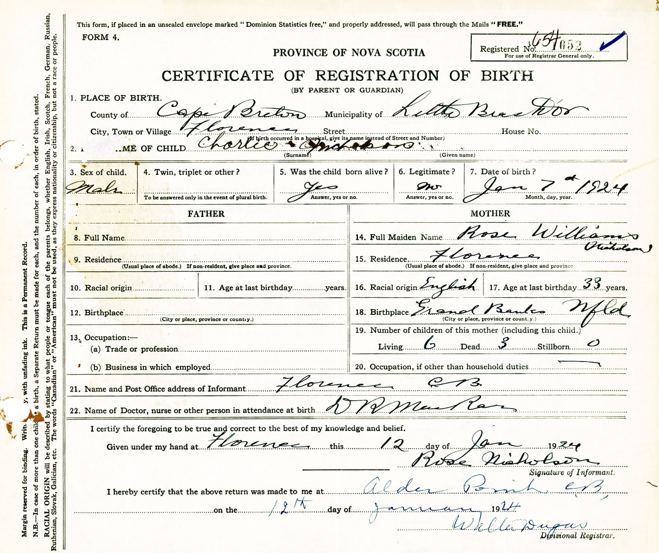 Male Birth Registration: Year: 1924 number: 65400052