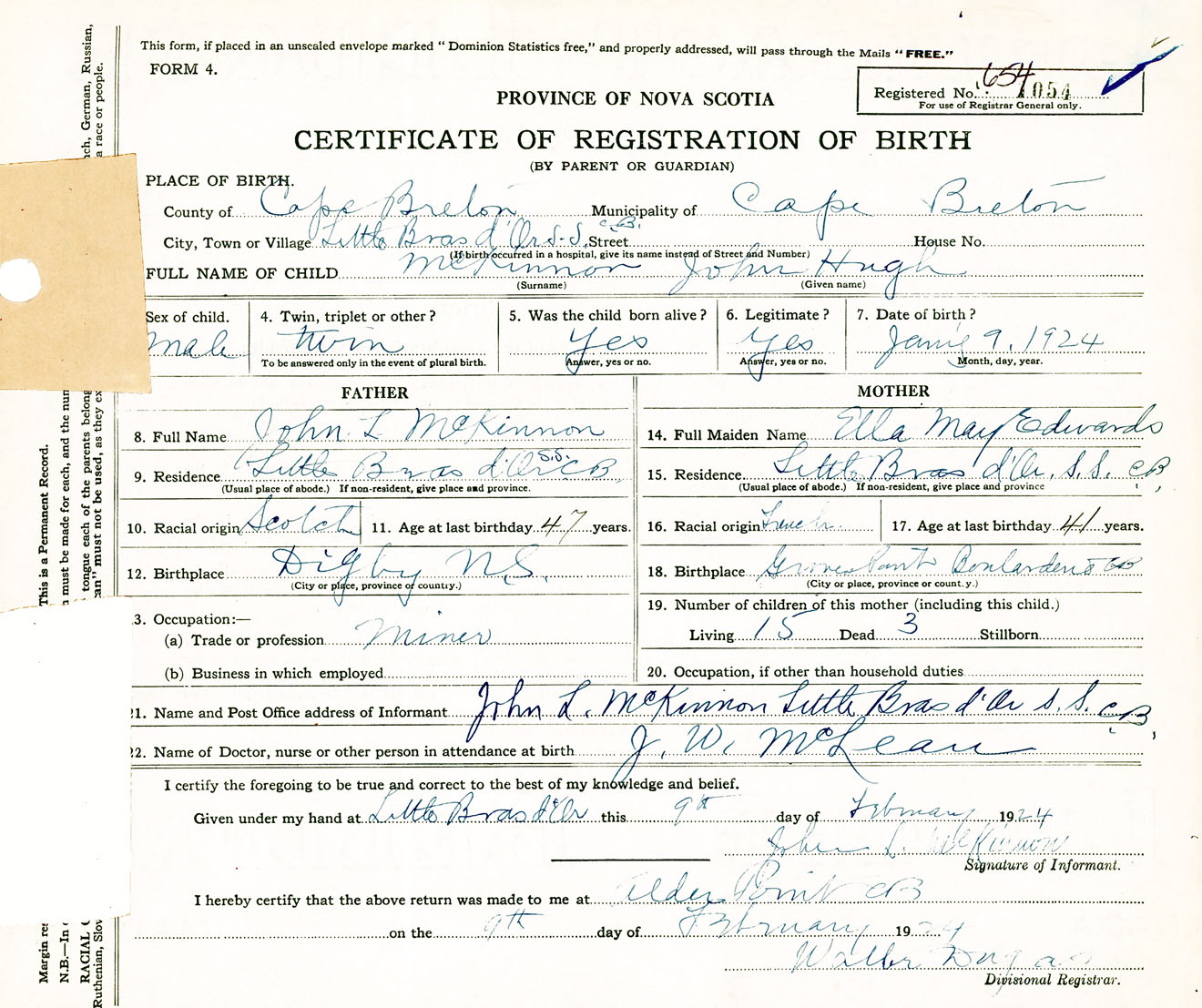 Male Birth Registration: Year: 1924 number: 65400054