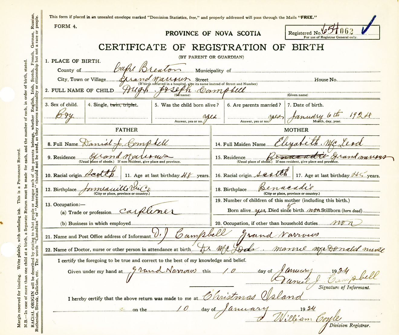 Male Birth Registration: Year: 1924 number: 65400062