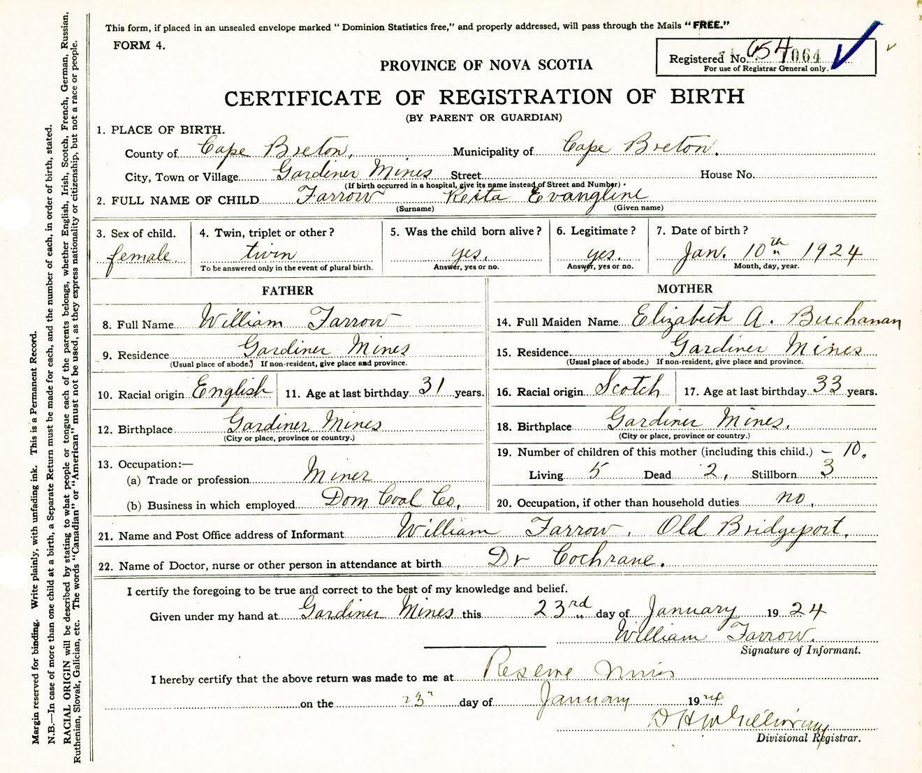 Female Birth Registration: Year: 1924 number: 65400064