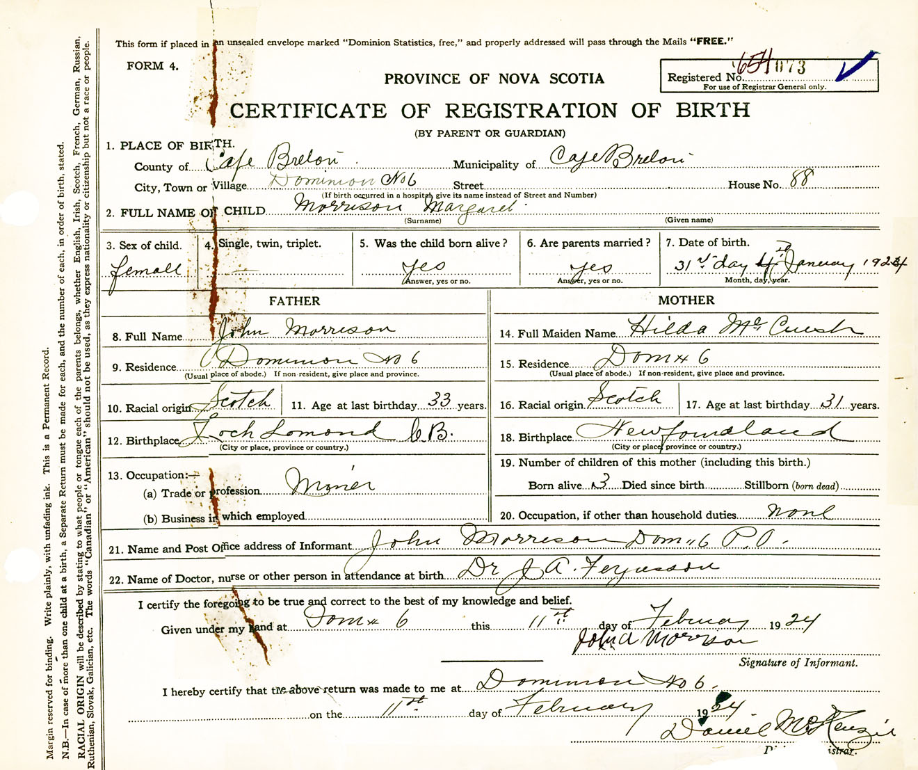 Female Birth Registration: Year: 1924 number: 65400073