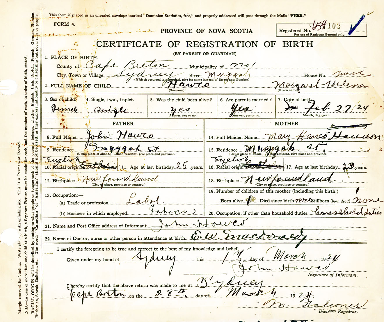 Female Birth Registration: Year: 1924 number: 65400102