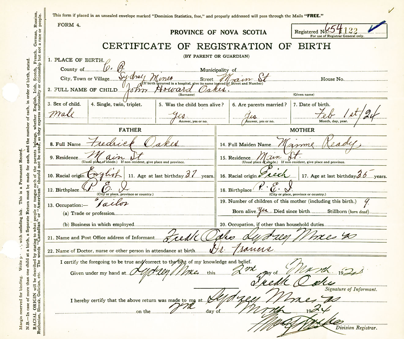 Male Birth Registration: Year: 1924 number: 65400122