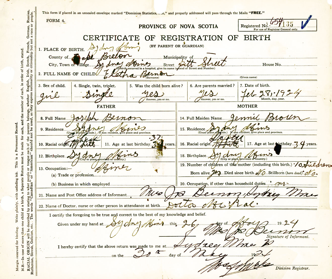 Female Birth Registration: Year: 1924 number: 65400135