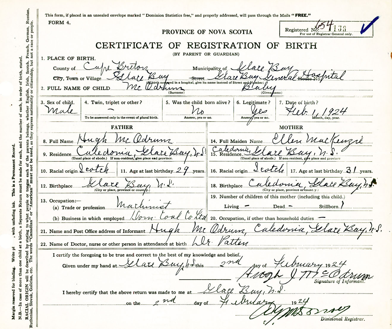 Male Birth Registration: Year: 1924 number: 65400136