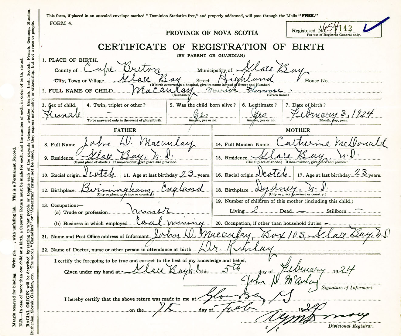 Female Birth Registration: Year: 1924 number: 65400142