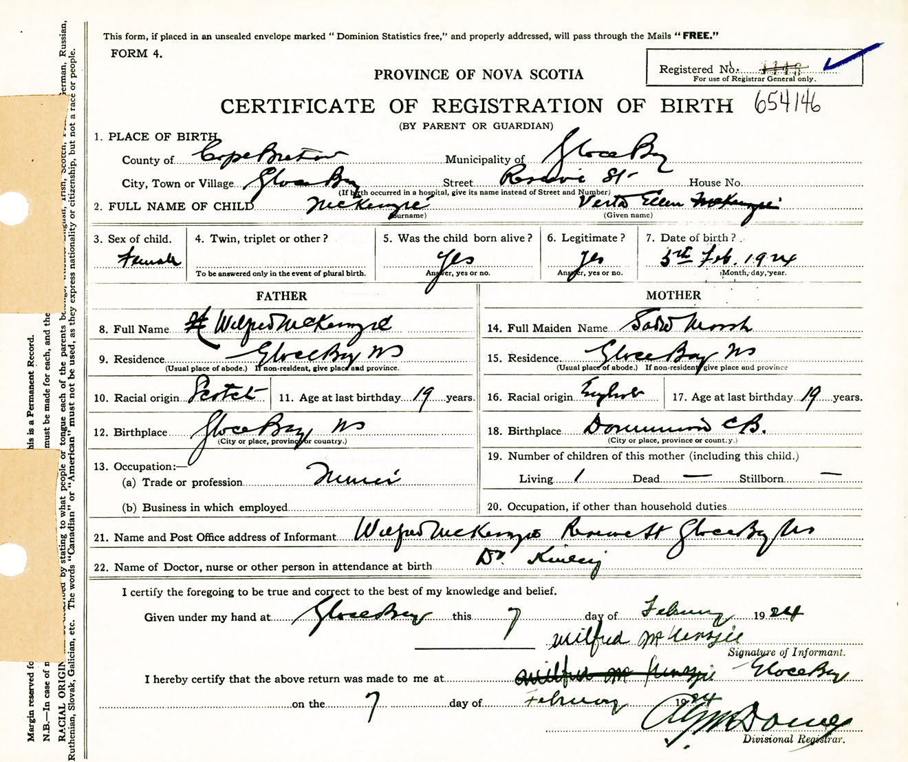Female Birth Registration: Year: 1924 number: 65400146