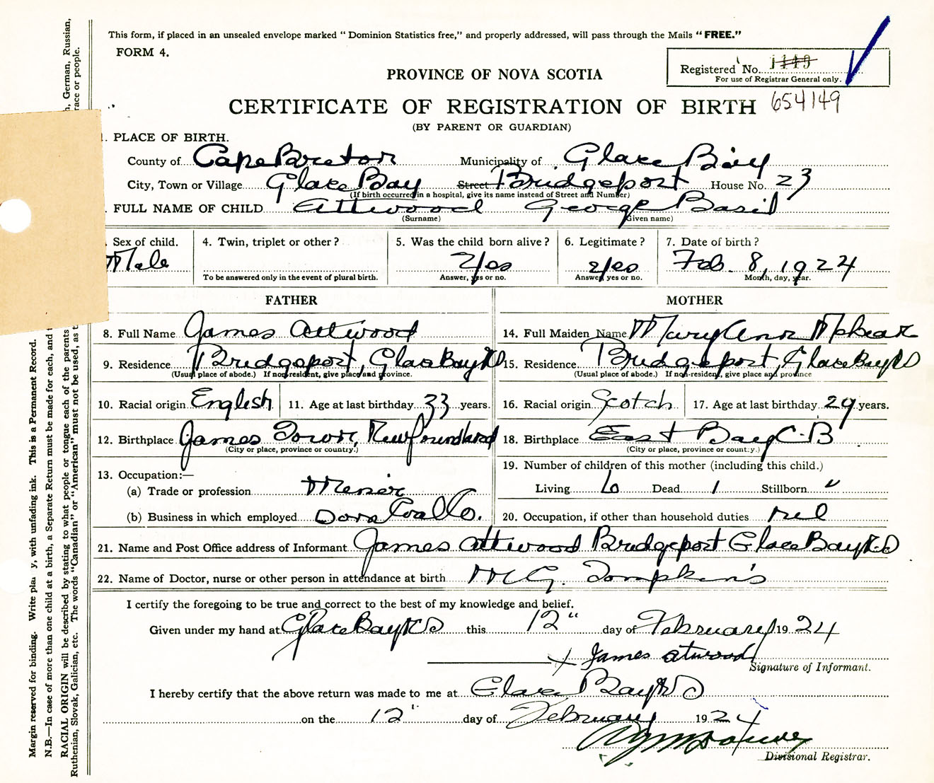 Male Birth Registration: Year: 1924 number: 65400149