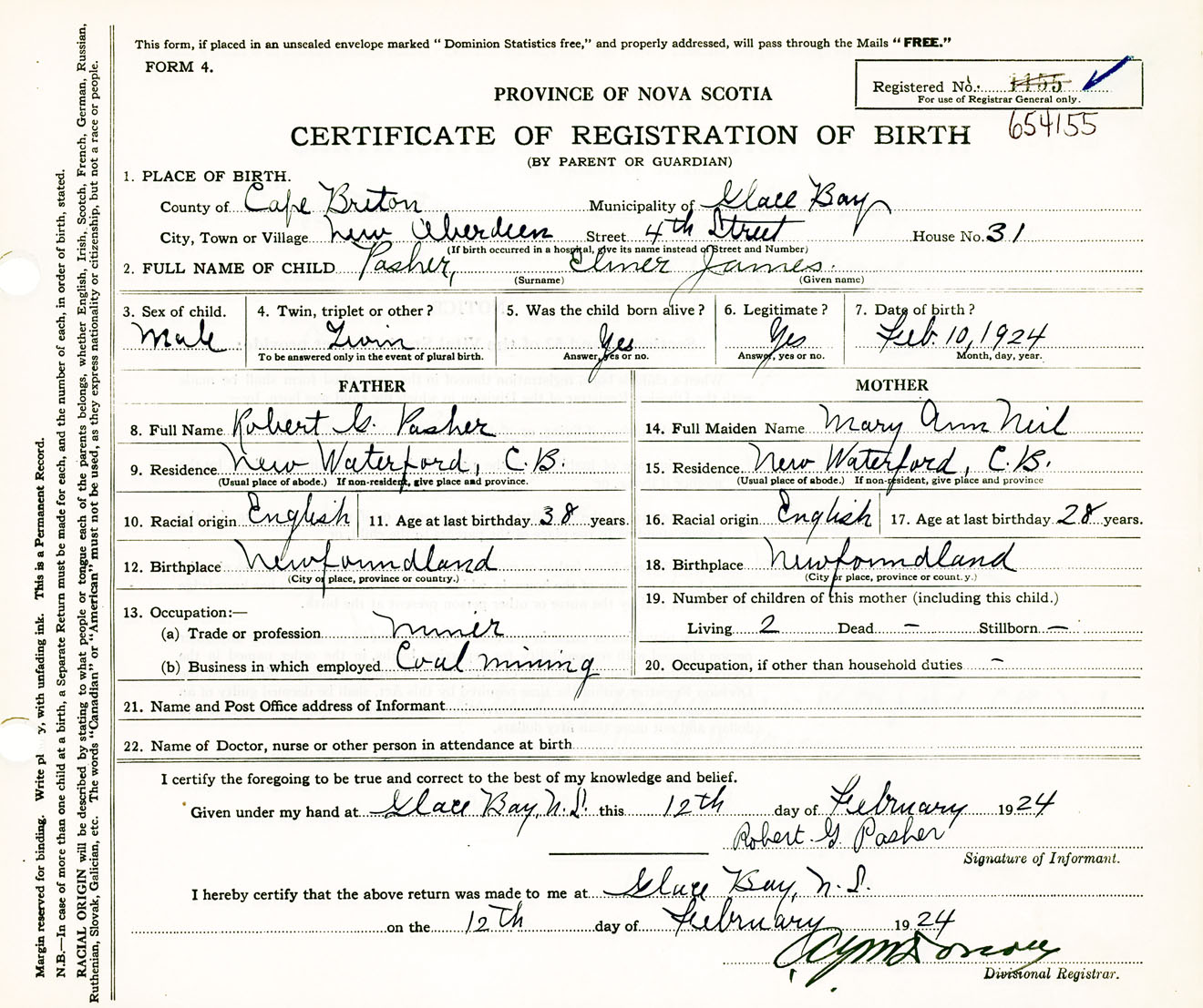 Male Birth Registration: Year: 1924 number: 65400155