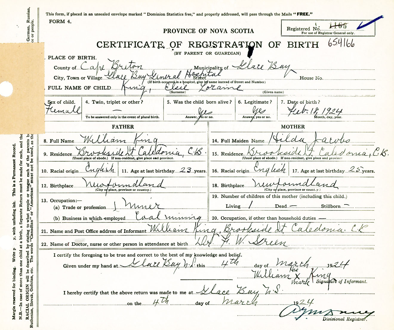 Female Birth Registration: Year: 1924 number: 65400166