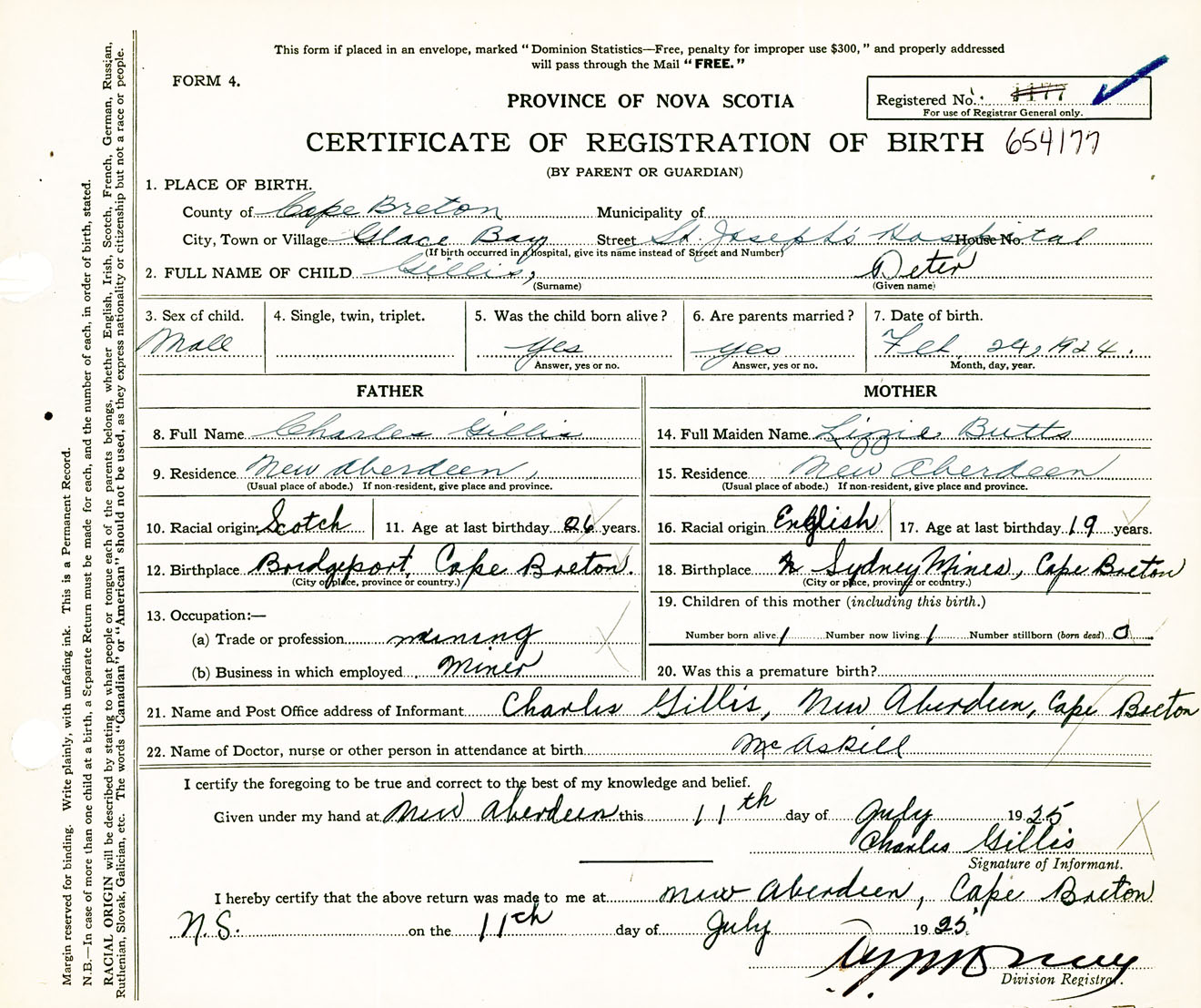 Male Birth Registration: Year: 1924 number: 65400177