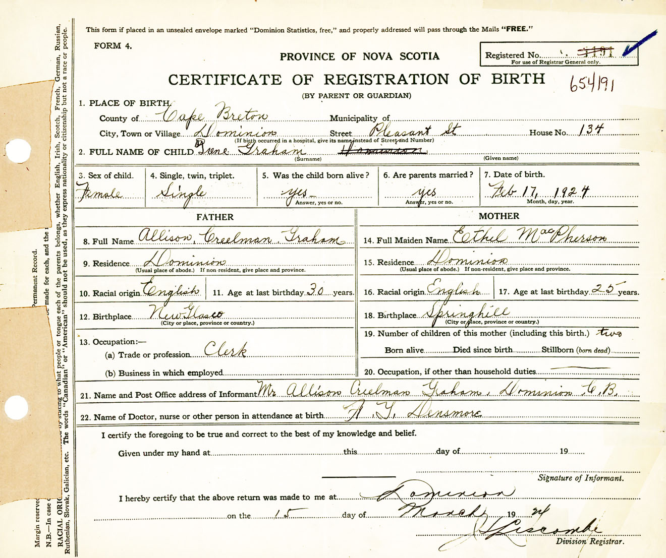 Female Birth Registration: Year: 1924 number: 65400191