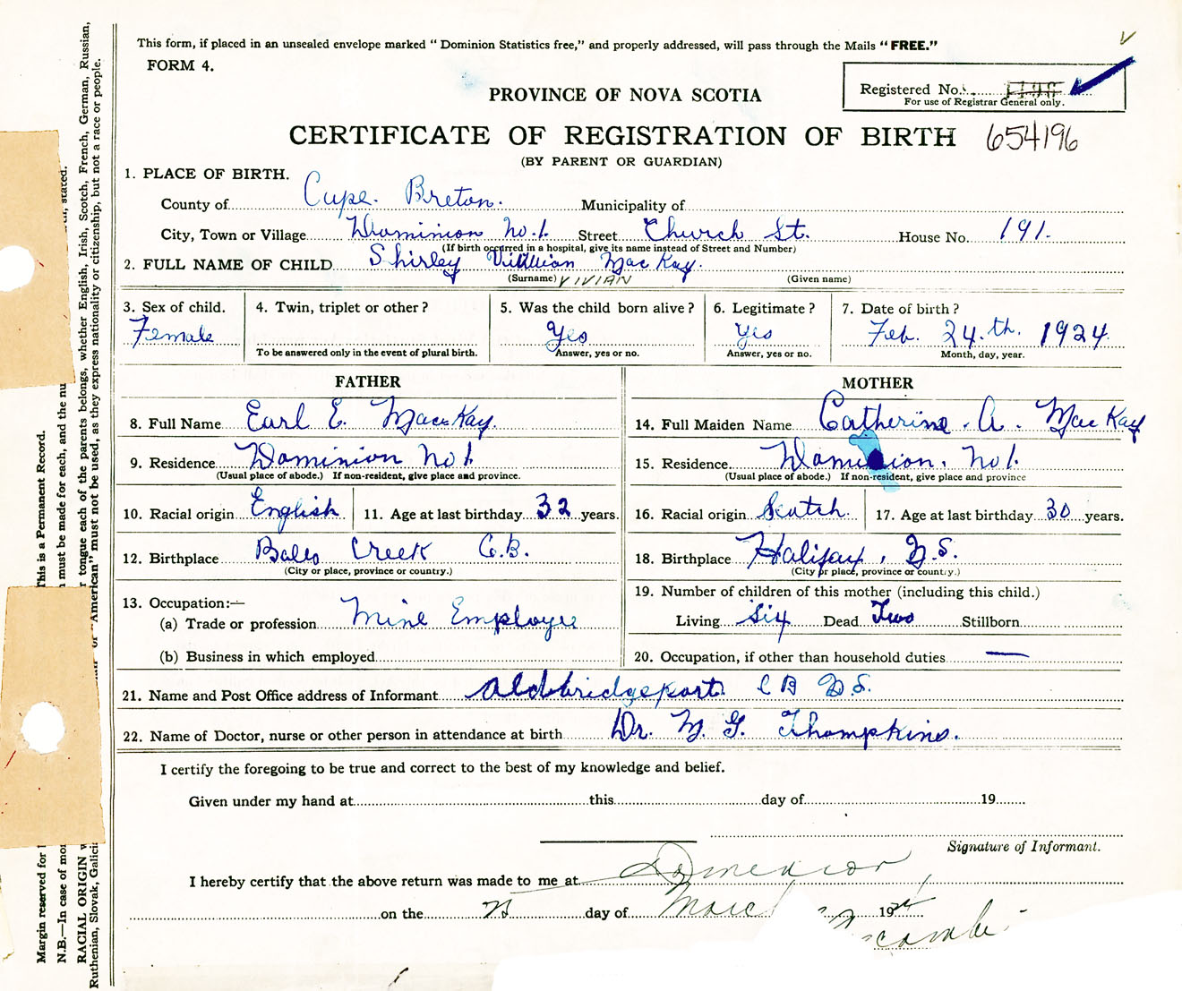 Female Birth Registration: Year: 1924 number: 65400196
