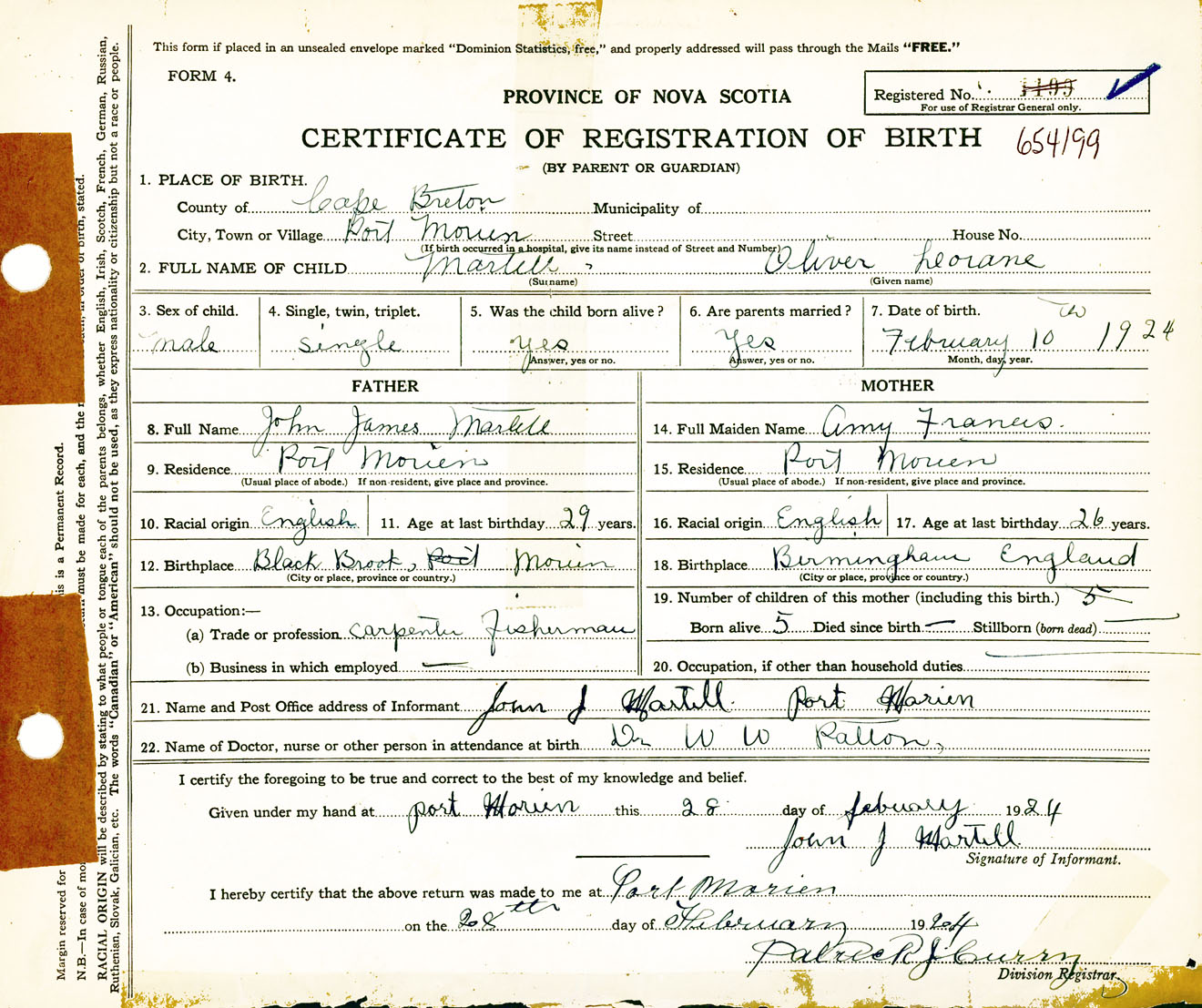Male Birth Registration: Year: 1924 number: 65400199