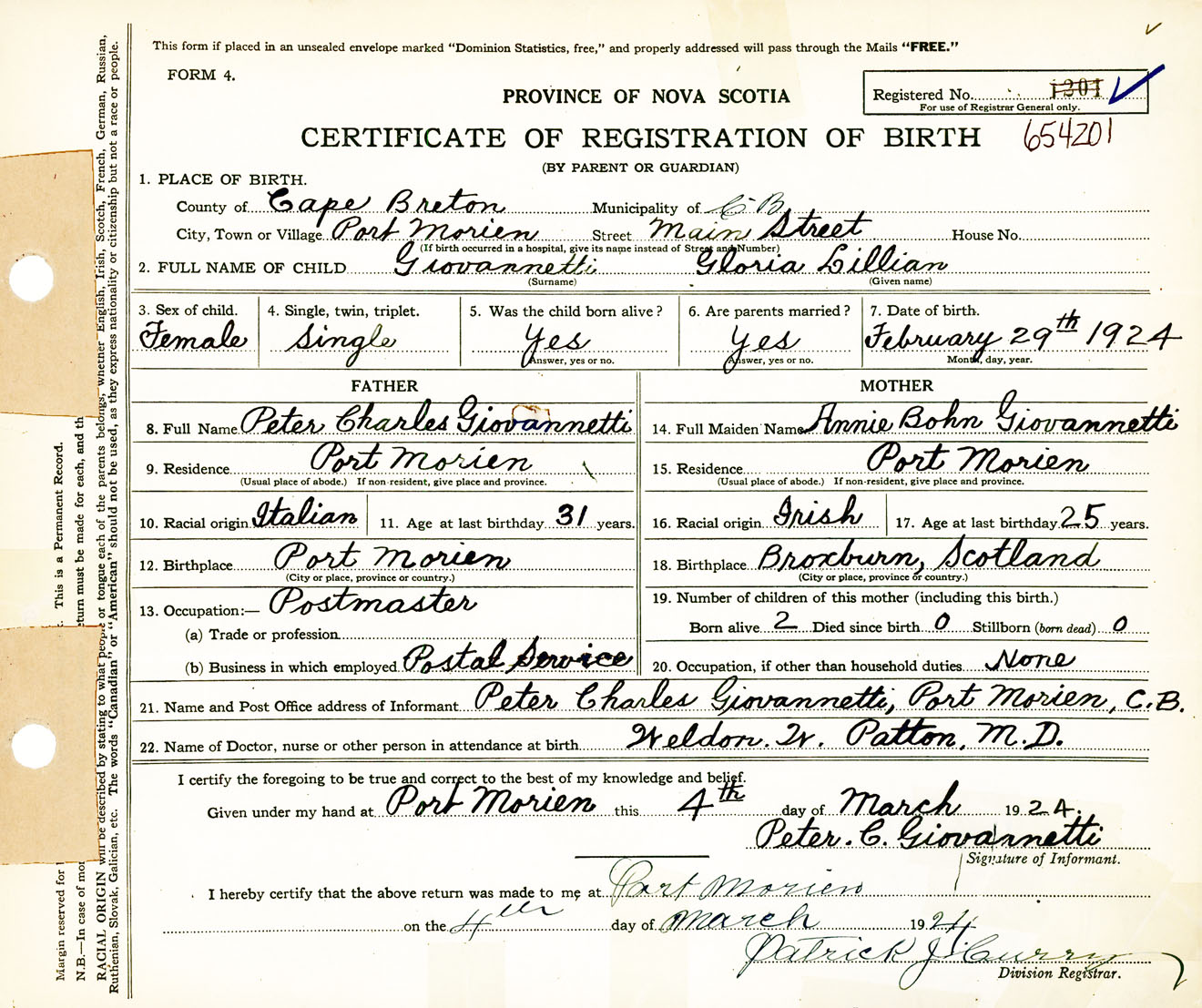 Female Birth Registration: Year: 1924 number: 65400201