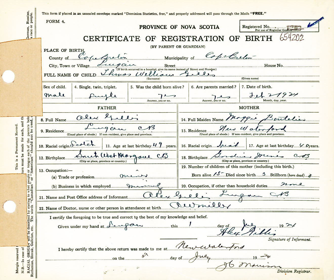 Male Birth Registration: Year: 1924 number: 65400202