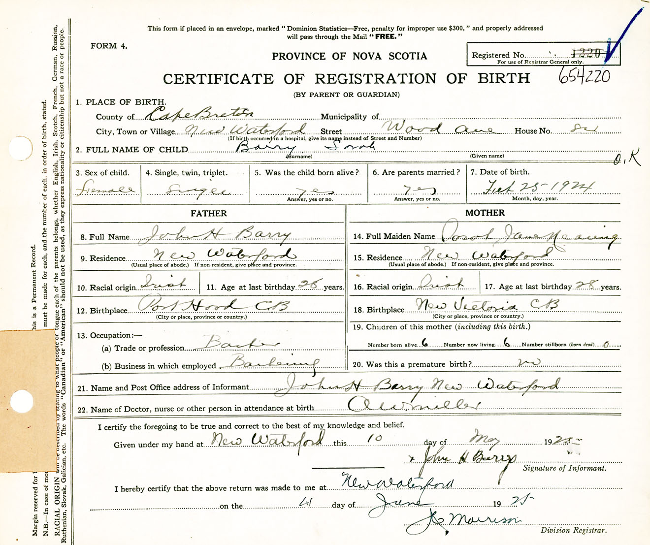 Female Birth Registration: Year: 1924 number: 65400220