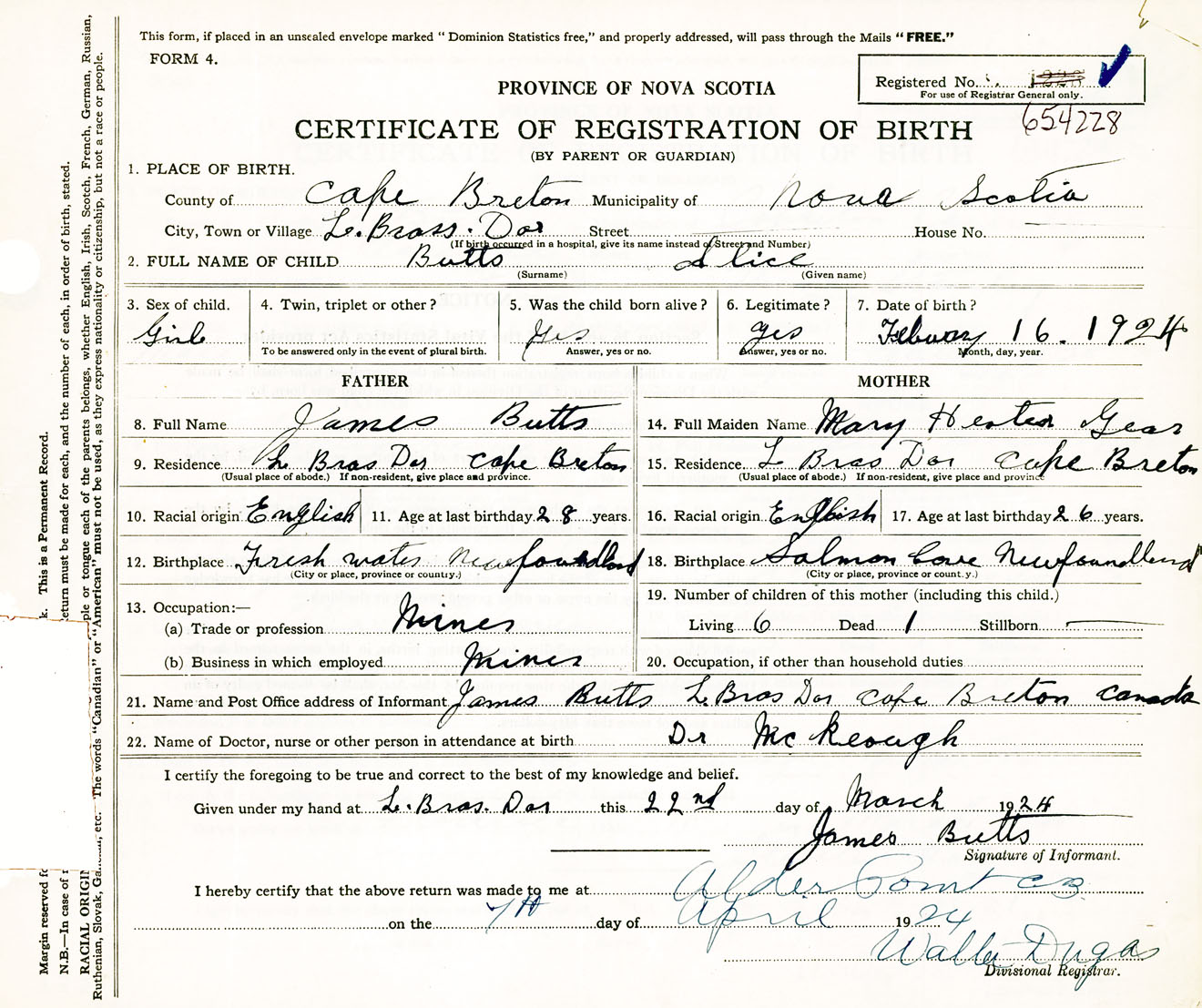 Female Birth Registration: Year: 1924 number: 65400228