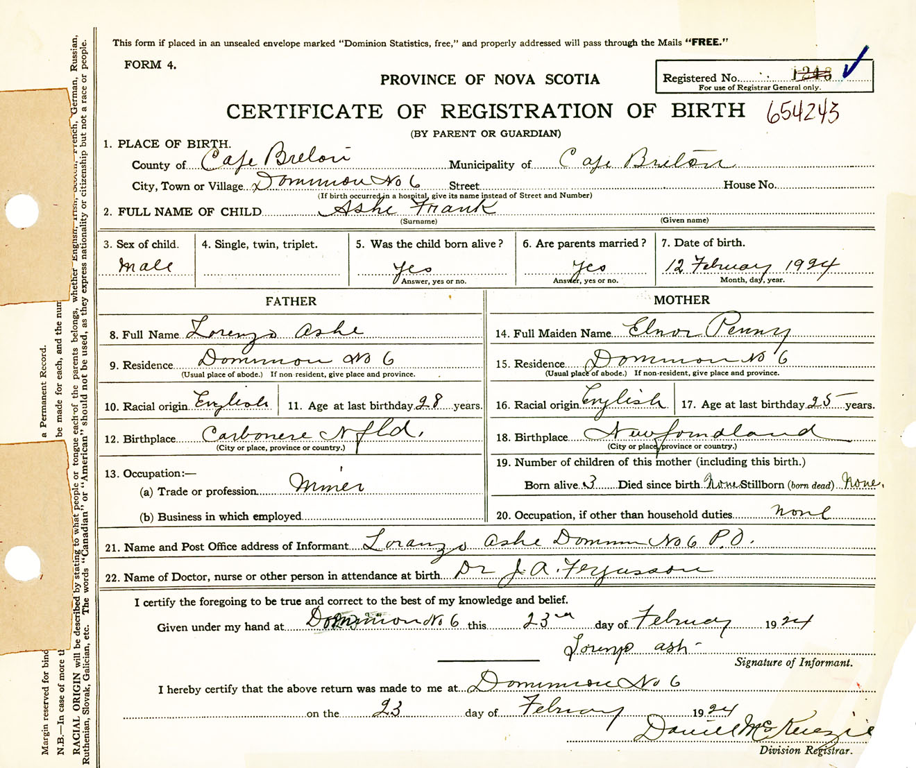 Male Birth Registration: Year: 1924 number: 65400243