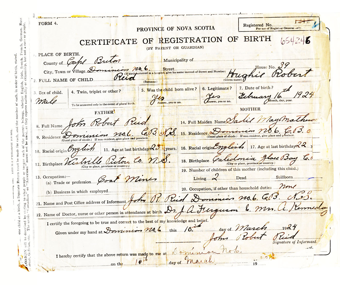 Male Birth Registration: Year: 1924 number: 65400246