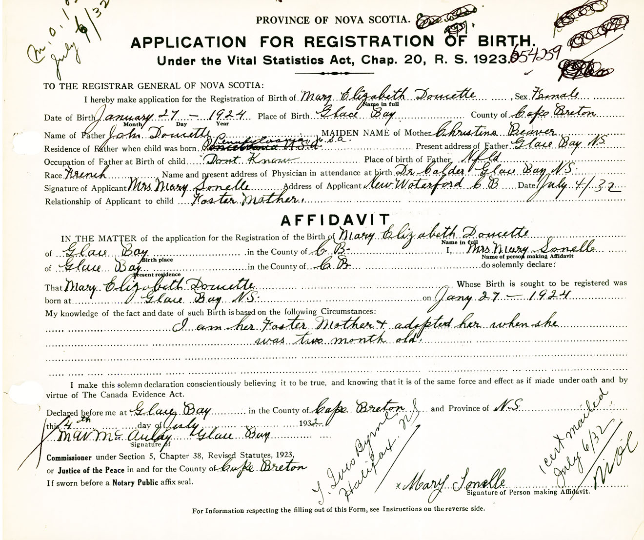 Signature of Applicant Mrs. Mary Sonelle Address of Applicant New Waterford, Cape Breton Co., NS Date 4 July 1932