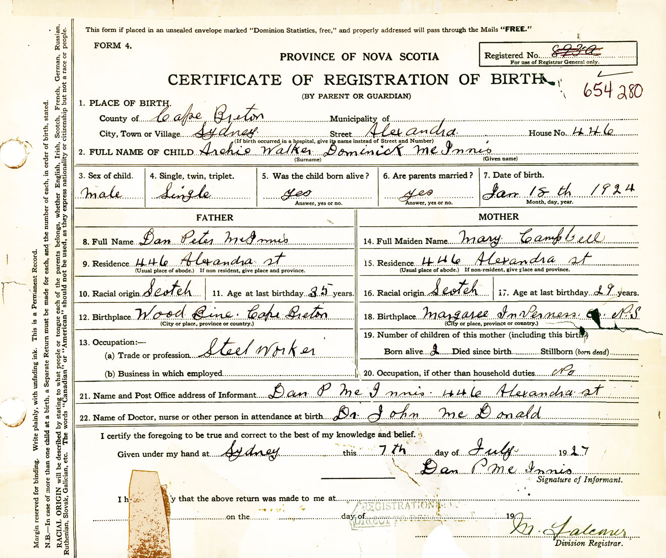 Male Birth Registration: Year: 1924 number: 65400280