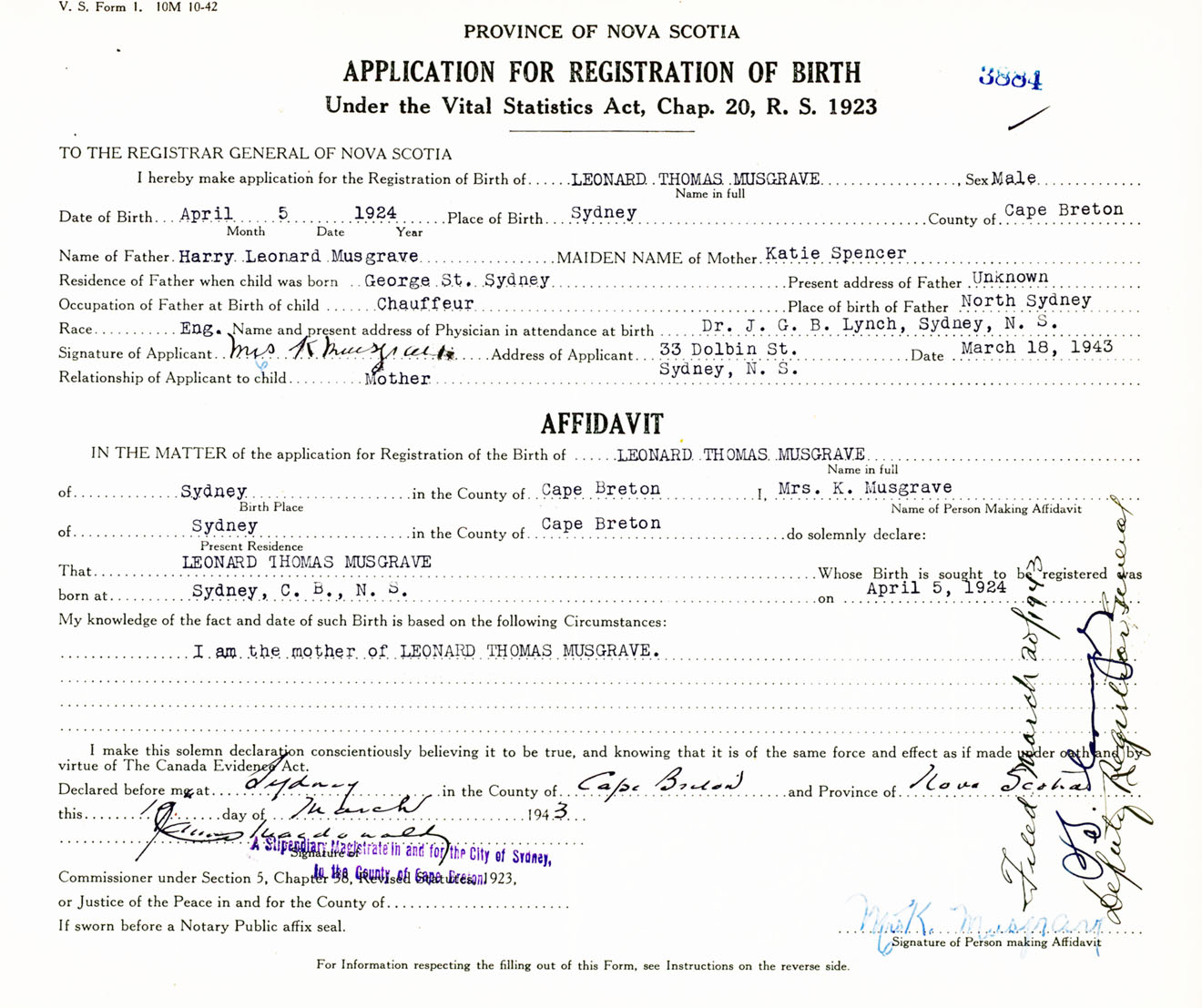 Signature of Applicant Mrs. K. Musgrave Address of Applicant 33 Dolbin Street, Sydney, Cape Breton Co., NS Date 18 March 1943