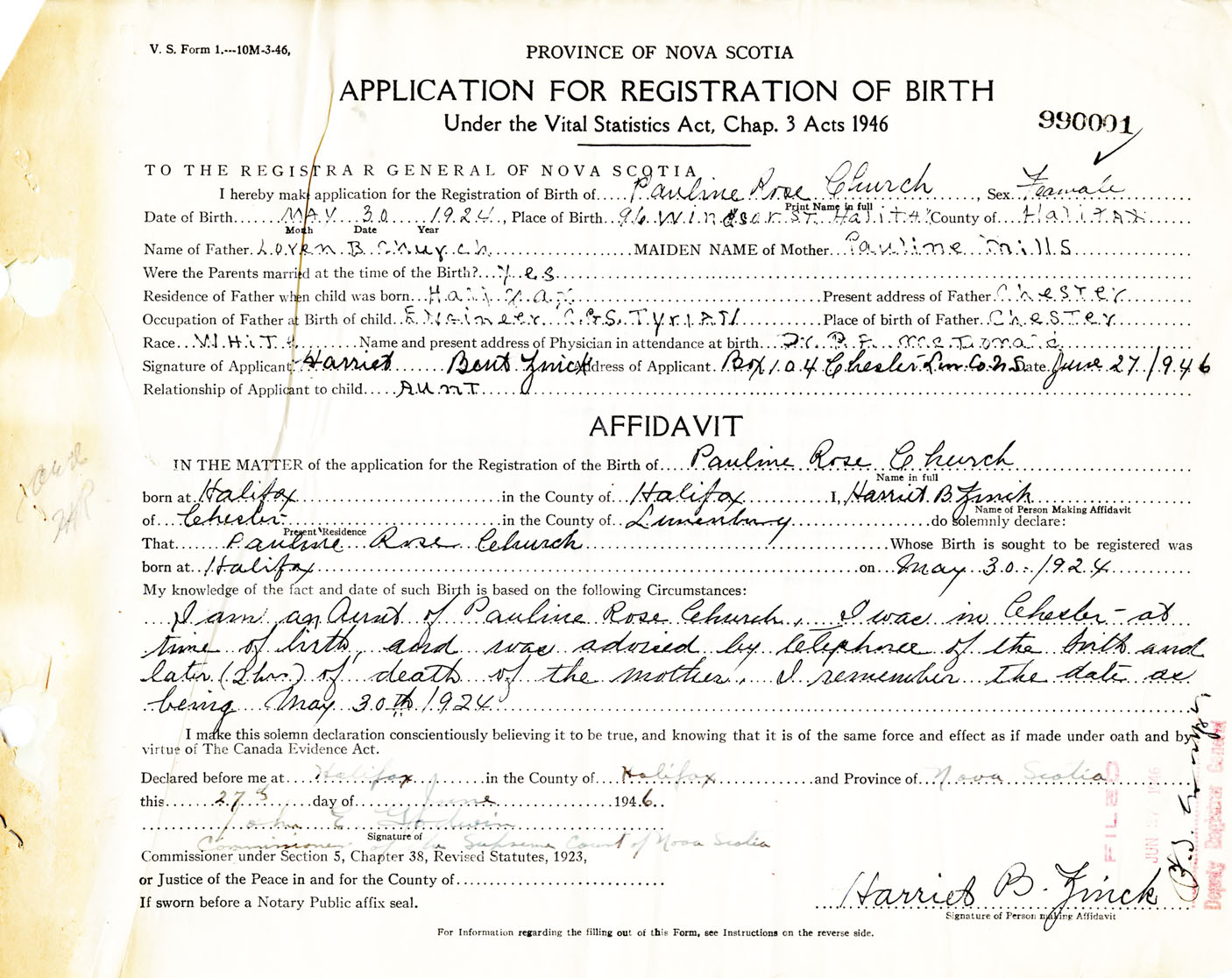 Signature of Applicant Harriet Bent Zinck Address of Applicant Box 104, Chester, Lunenburg Co., NS Date 27 June 1946