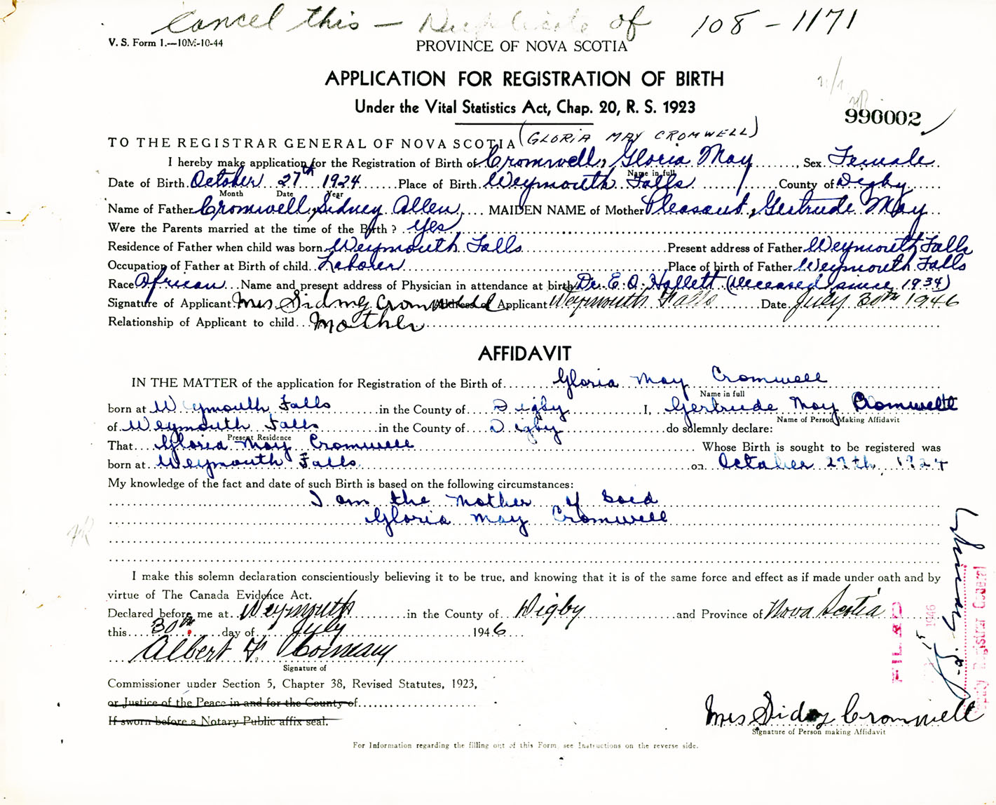 IN THE MATTER of the application for the Registration of the Birth of Gloria MayCromwell