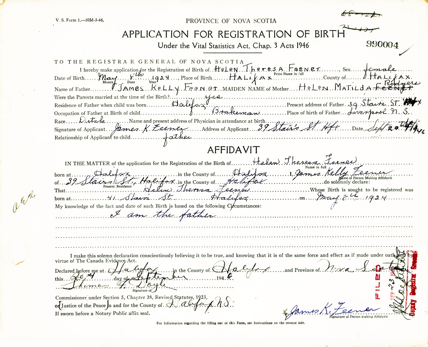 Signature of Applicant James K. Feeney Address of Applicant 39 Stairs Street, Halifax, NS Date 20 September 1946