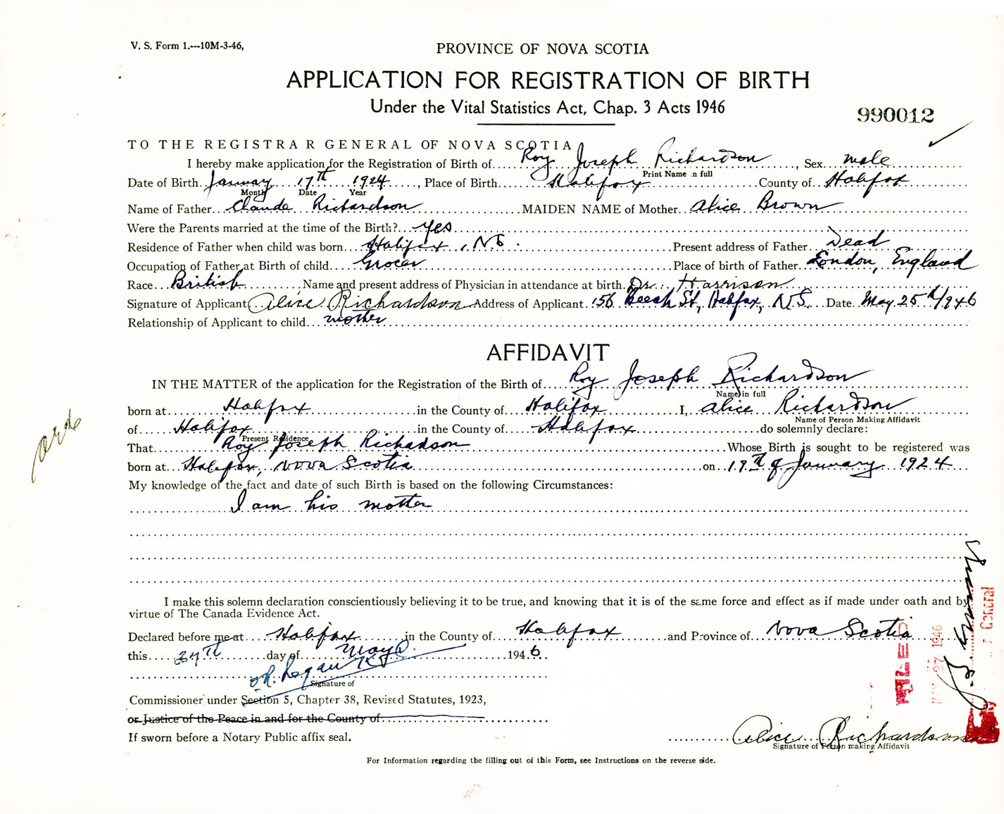 Signature of Applicant Allice Richardson Address of Applicant 156 Beech Street, Halifax, NS Date 25 May 1946