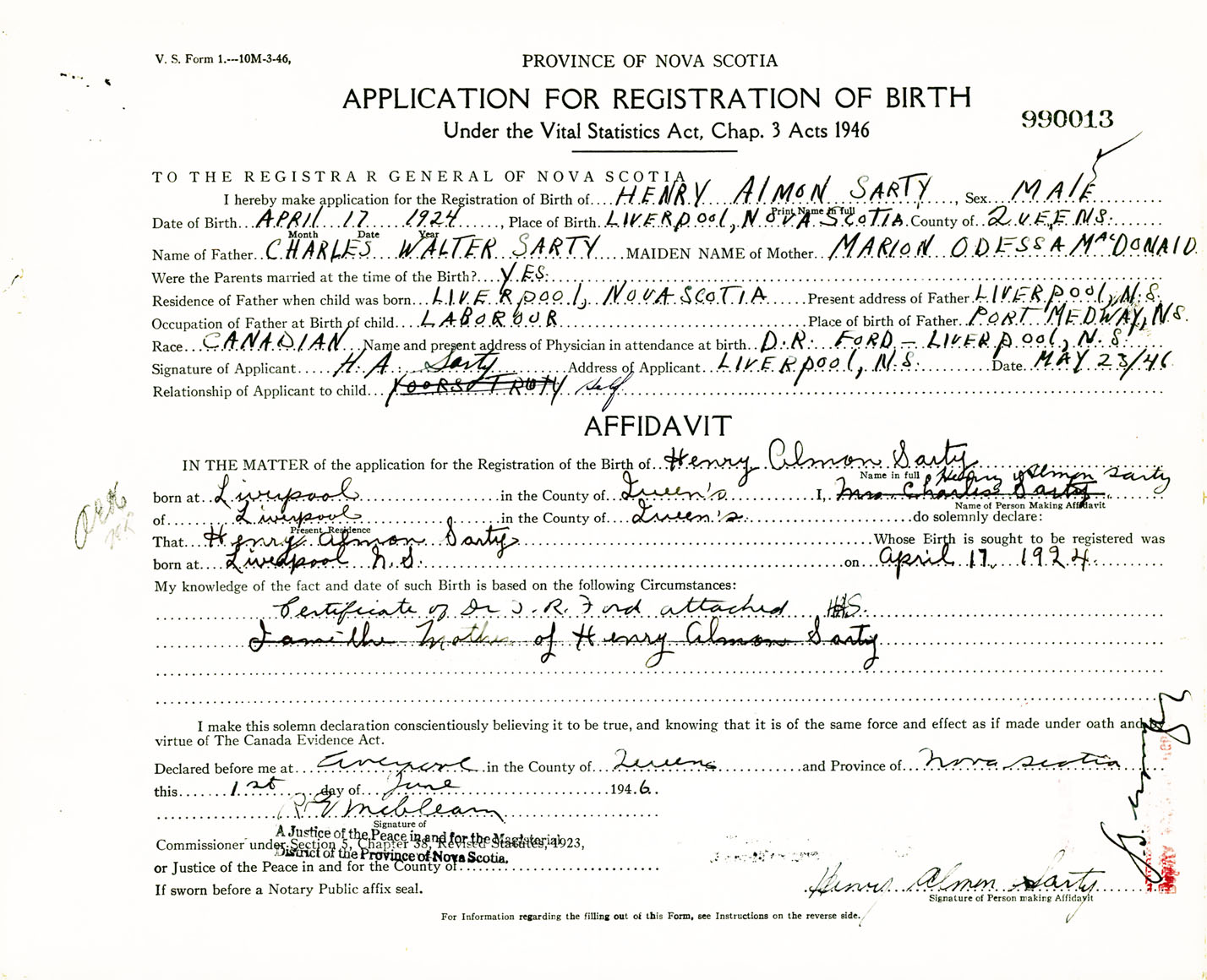 Signature of Applicant H. A. Sarty Address of Applicant Liverpool, Queens Co., NS Date 23 May 1946
