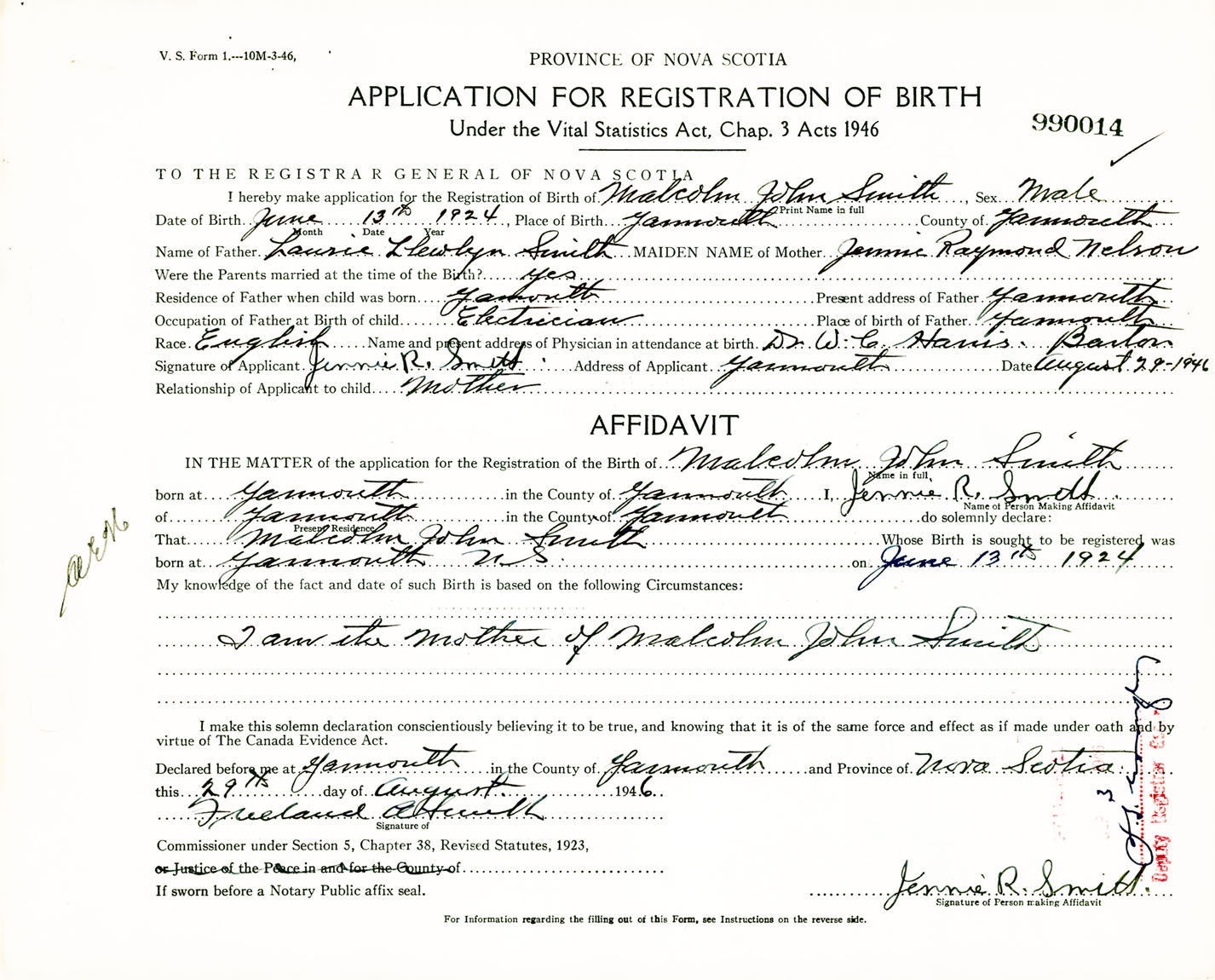 Signature of Applicant Jennie R. Smith Address of Applicant Yarmouth, NS Date 29 August 1946