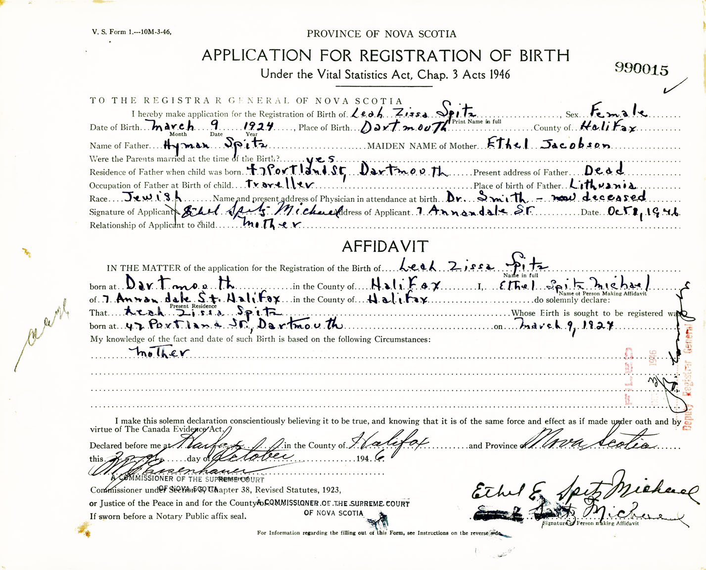 Signature of Applicant Ethel Spitz Michael Address of Applicant 7 Annandale Street, Halifax, NS Date 8 October 1946