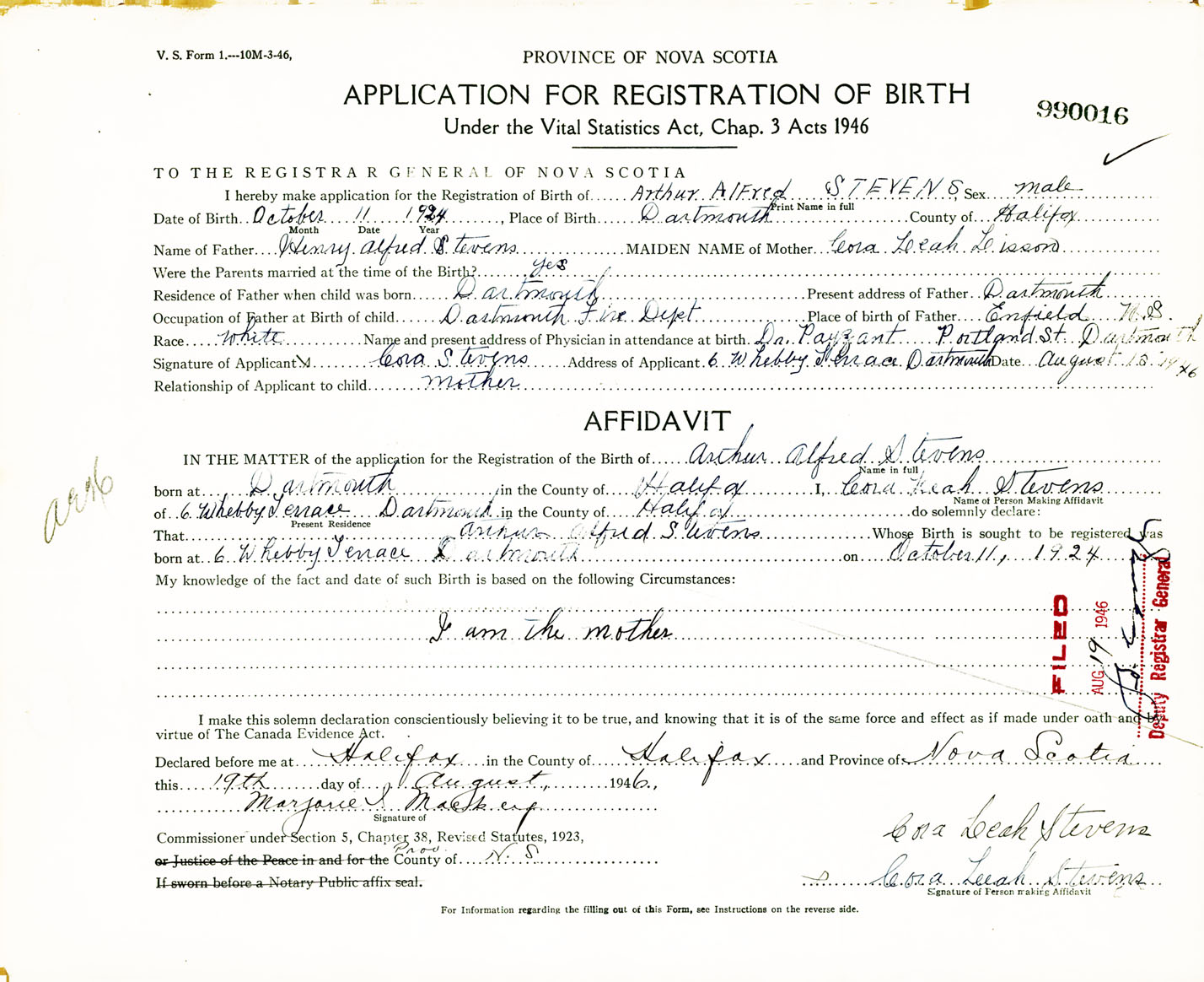Signature of Applicant Cora Stevens Address of Applicant 6 Whebby Terrace, Dartmouth, NS Date 18 August 1946