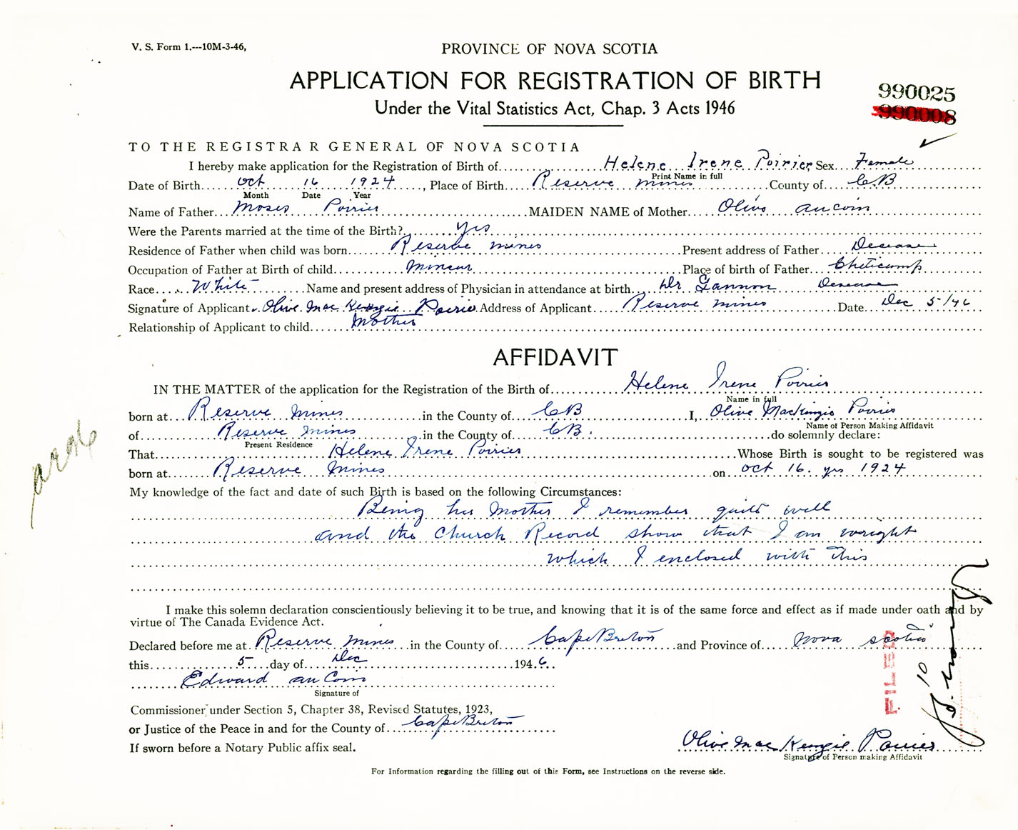 Signature of Applicant Olive MacKenzie Poirier Address of Applicant Reserve Mines, Cape Breton Co., NS Date 5 December 1946