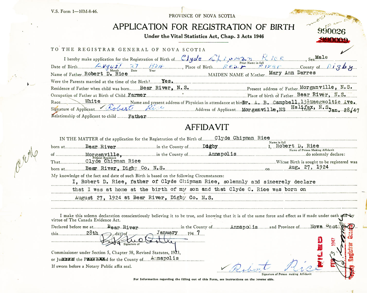 I, Robert D. Rive, father of Clyde Chipman Rice, solemnly and sincerely declare that I was at home at the birth of my son and that Clyde C. Rice was born on August 27, 1924 at Bear River, Digby Co., NS