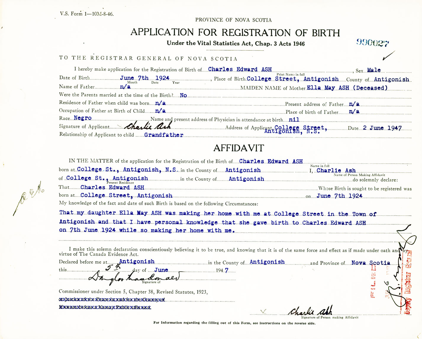 Signature of Applicant Charlie Ash Address of Applicant College Street, Antigonish, NS Date 2 June 1947