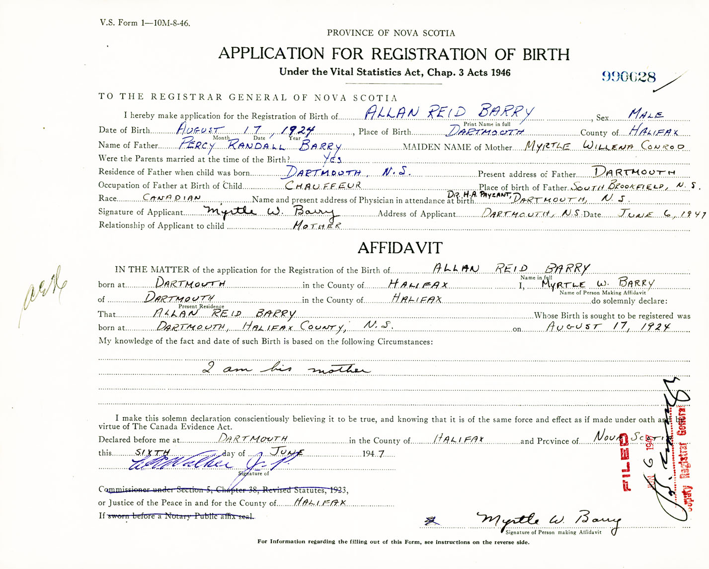 Signature of Applicant Myrtle W. Barry Address of Applicant Dartmouth, Halifax Co., NS Date 6 June 1947