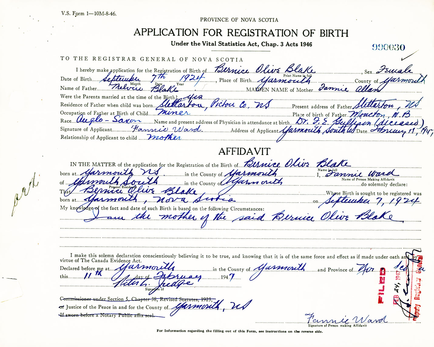 Signature of Applicant Fannie Ward Address of Applicant Yarmouth South, NS Date 11 February 1947