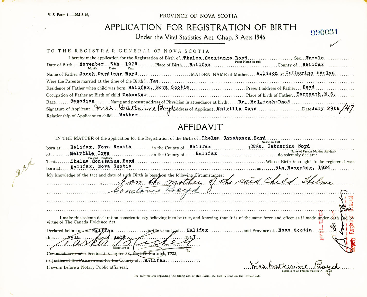 Signature of Applicant Mrs. Catherine Boyd Address of Applicant Melville Cove, Halifax, NS Date 29 July 1947