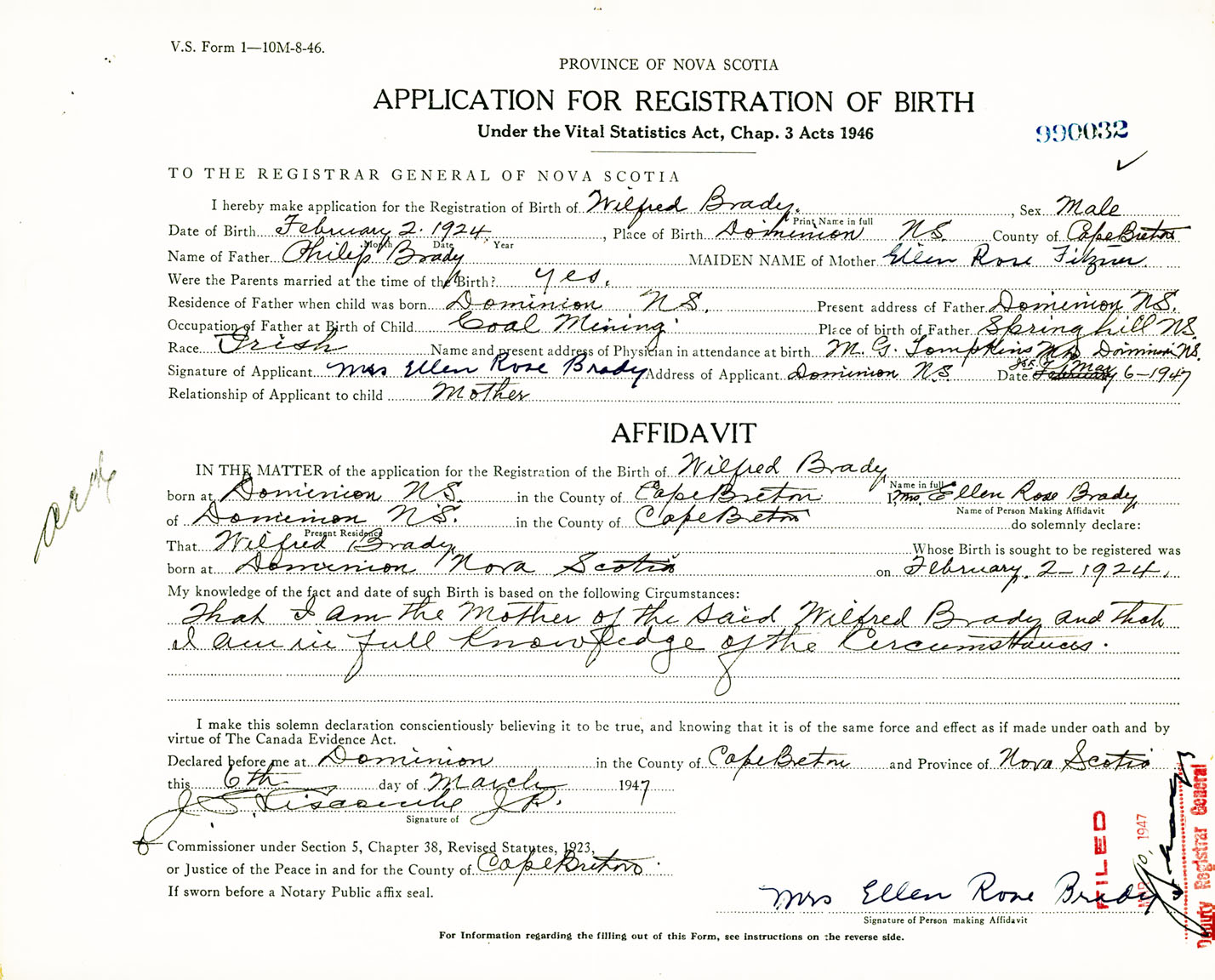Signature of Applicant Mrs. Ellen Rose Brady Address of Applicant Dominion, Cape Breton Co., NS Date 6 May 1947
