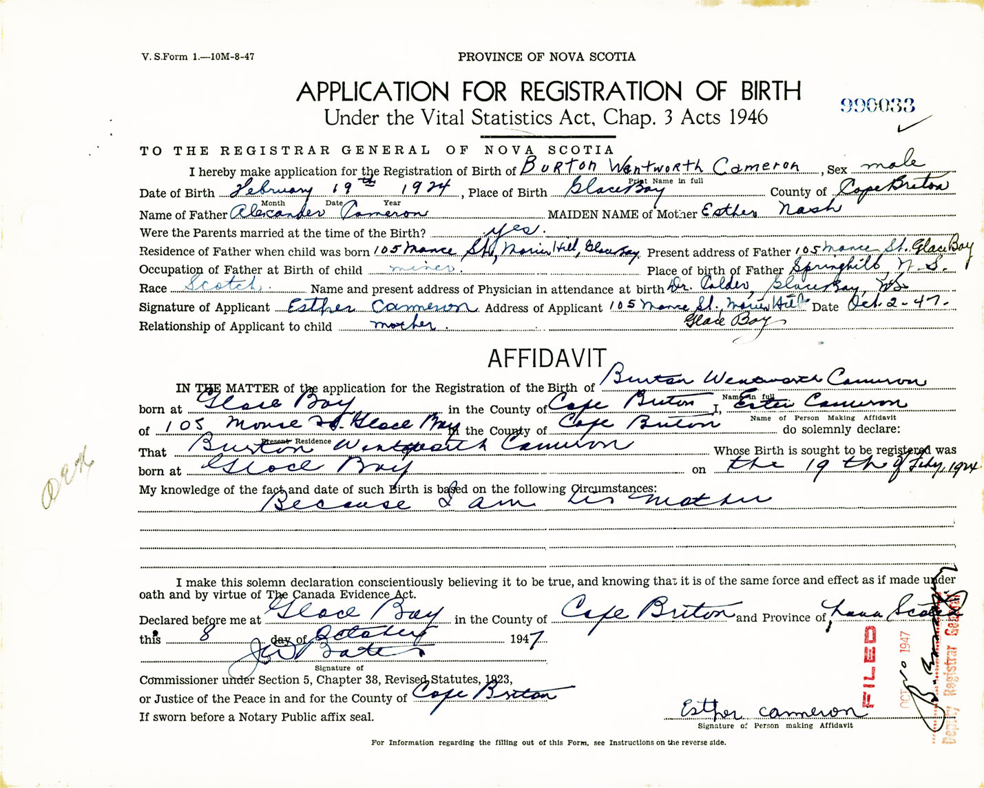Signature of Applicant Esther Cameron Address of Applicant 105 Manse Street, Morien Hill, Glace Bay, NS Date 2 October 1947