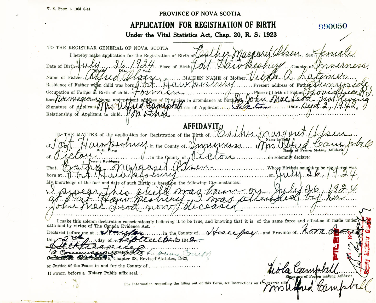 I swear this child was born on July 26, 1924 at Port Hawkesbury. I was attended by Dr. John MacLeod, now deceased