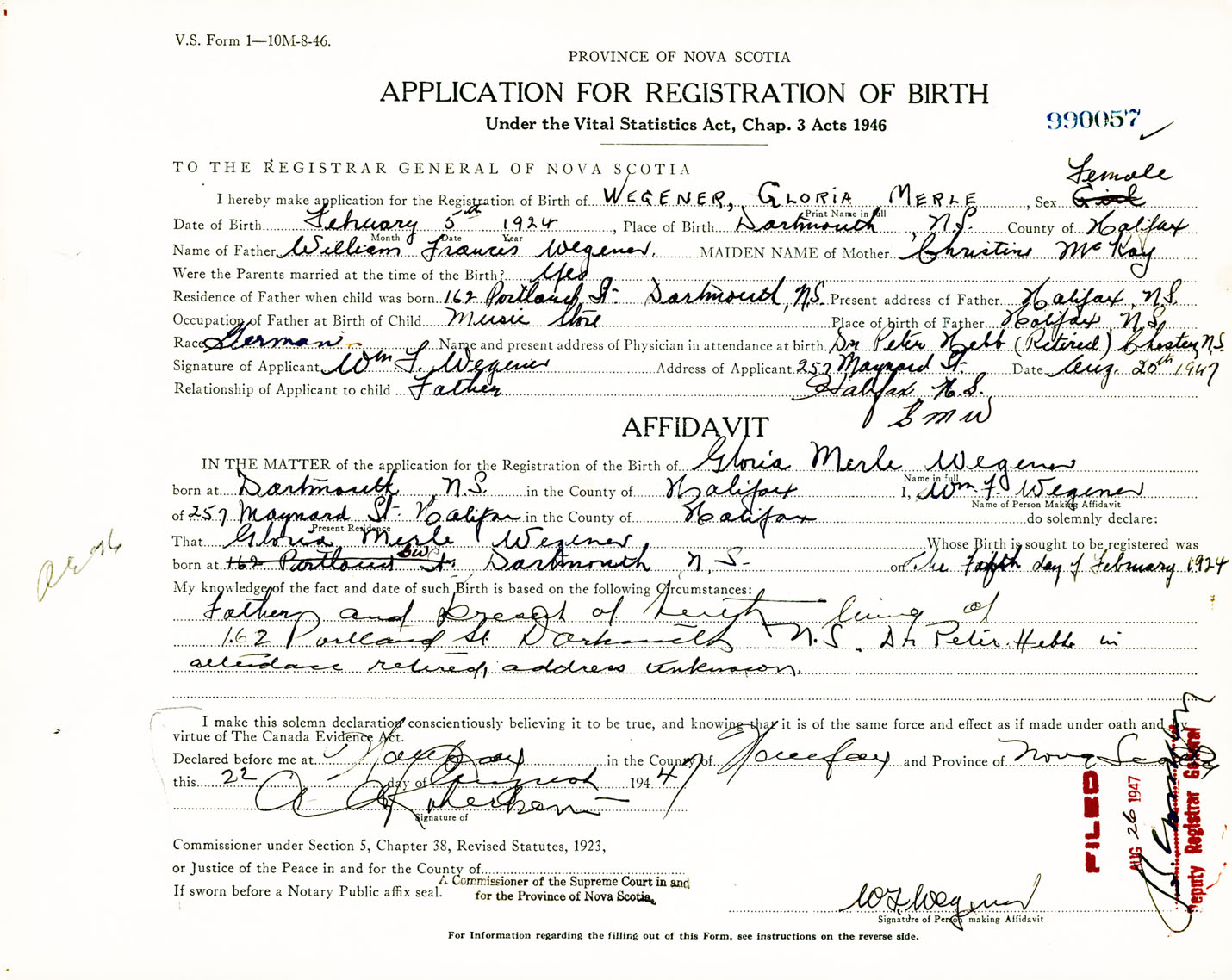 Signature of Applicant William F. Wegener Address of Applicant 257 Maynard Street, Halifax, NS Date 20 August 1947