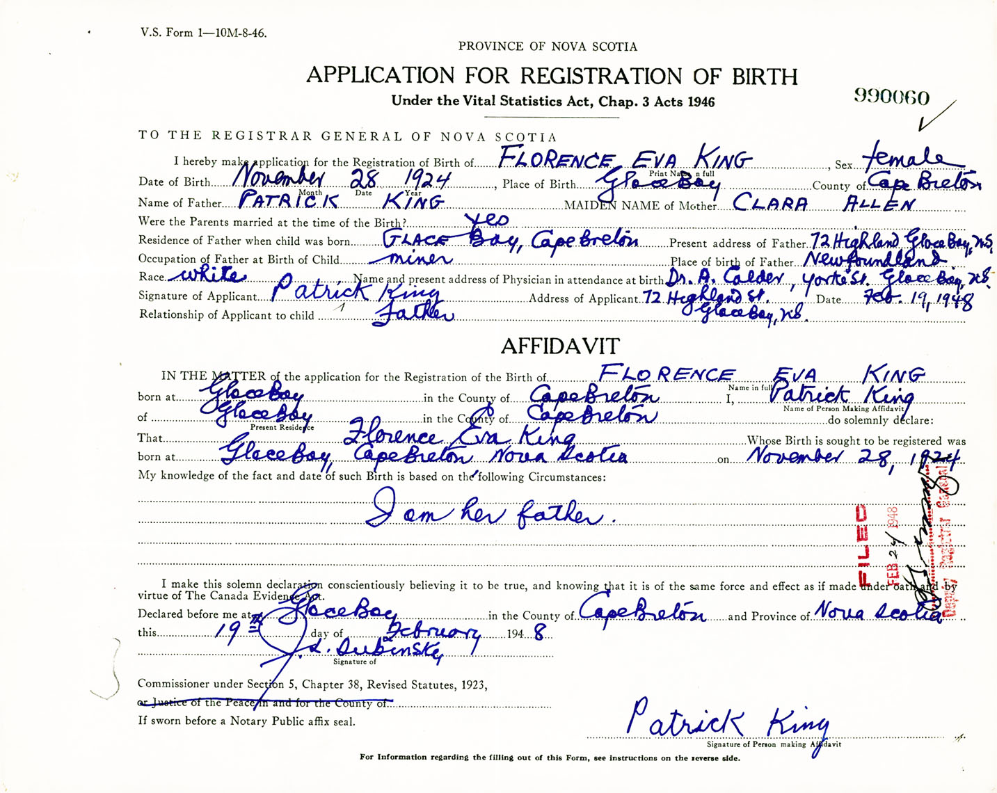 Signature of Applicant Patrick King Address of Applicant 72 Highland Street, Glace Bay, Cape Breton Co., NS Date 19 February 1948